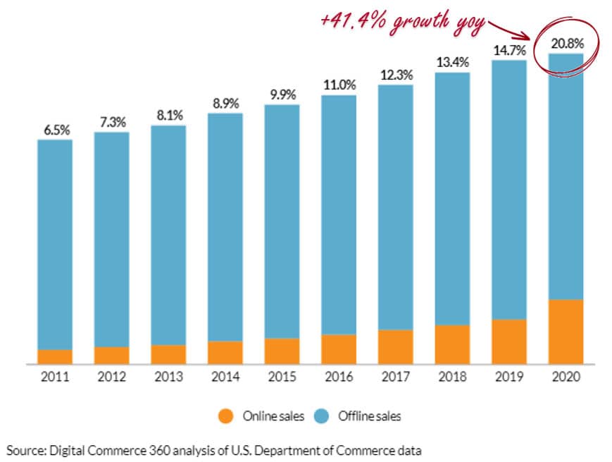 The Coronavirus pandemic has increased the moat and growth trajectory of many of the tech stocks – which is in direct contrast to the remaining businesses on the S&P500. The Chart below shows the increase in online sales as a percentage of total retail sales in the US in Q2 2020 versus the same period for the past 10 years. The market for e-commence has expanded enormously (41.4% year on year), and much of this growth is here to stay