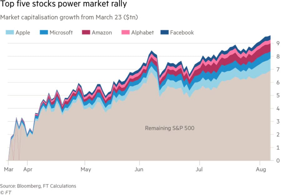The targeted tech stocks are well known: Amazon, Alphabet (Google’s parent company), Apple, Microsoft and Facebook. These five stocks are together the largest in the S&P 500 and account for a quarter of the market rally since the market troughed in late March this year. Their weighting in the S&P 500 index, at 20%, is the largest weighting for the top five since 1980. If other well-known tech businesses (like Netflix and Tesla) are included this proportion would rise to nearly 25%.