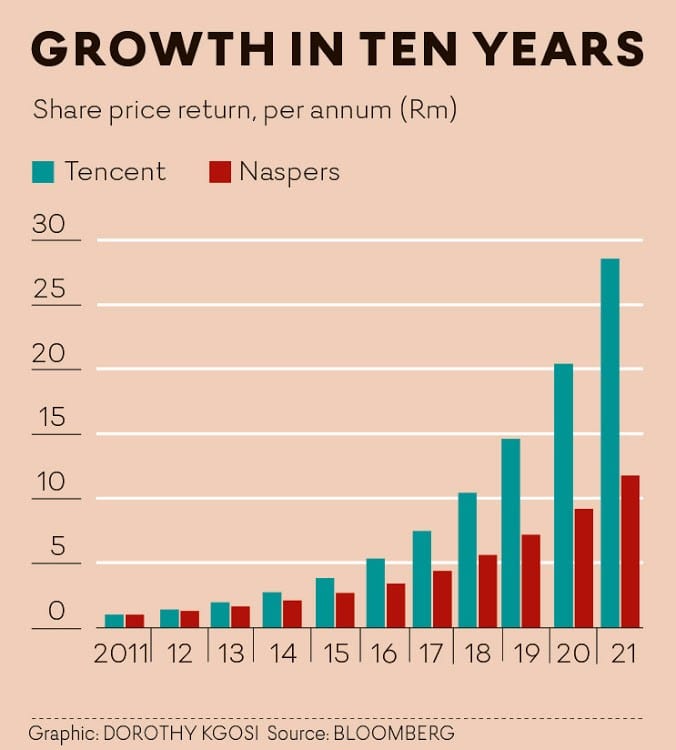 Tencent has delivered a share price return of 39.86% per annum in the ten years to May 31, 2021. Naspers has delivered 28%. Had you invested a million rand in Tencent in May 2011, you would have R28.6 million today. You would have R11.8 million had you invested in Naspers.