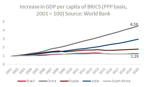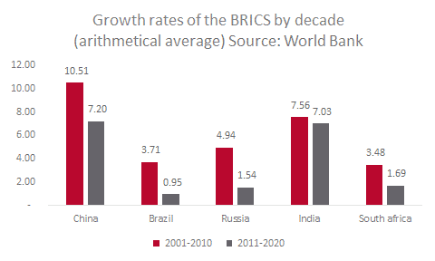 In the decade to 2010 (2000-2010), commodity exporting countries, which accounted for the majority of the BRICS countries, benefitted from China’s rise because as China’s economy grew so did its demand for commodities. This no longer the case. While China’s GDP continued to grow strongly in the decade to 2020 (2010-2020), the GDP growth performances of South Africa, Brazil and Russia have been poor. India’s economy, which continued to perform well in the decade to 2020, is not a commodity exporter.