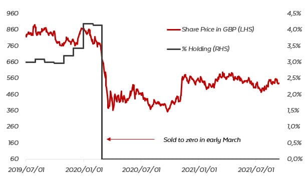 Our original thesis no longer held. Rather than attempting to construct a new thesis (which in this case would be a recovery play – an entirely different investment case) we sold the share at c.600 GBp.