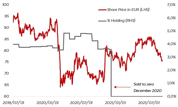 Chart 2: Heineken Holding share price versus holding % in the Flagship Global Funds