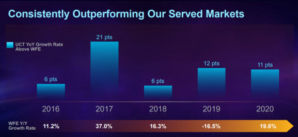 UCT is one of the key equipment providers to both Applied Materials and LAM Research, two of the industry’s biggest providers of semiconductor capital equipment. UCT supplies them with gas and fluid delivery systems, precision robotics and other subsystems. UCT has also expanded their offering to now include a servicing and analytics division, enabling their downstream partners to operate at higher yields, thereby increasing efficiency and profitability.