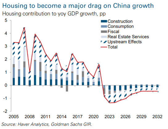 Much of China’s economic growth remains investment-led, and a large proportion of investment has gone into home construction. The chart below (and there are many others that corroborate this) shows that instead of the tailwind it has been for nearly 2 decades. the contribution from housing is set to become a headwind to GDP growth. Simplistically, this means the 6% GDP growth rate we have become accustomed to can halve if other sectors of the economy (consumption, government spending or net exports) don’t fill the gap.