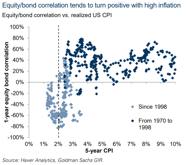 The chart below shows that the correlation between equities and bonds tends to turn positive in times of higher inflation. Therefore, the risk of investing in bonds relative to equities increases with greater inflation as returns (both up and down) will be more correlated, but with bonds carrying arguably more price risk.