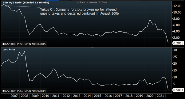 Chart 1: The P/E (1 year forward) as well as the share price of Gazprom from 2006 – 2022