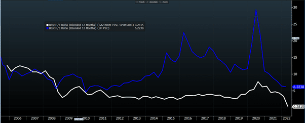 Chart 2: The P/E (1 year forward) of BP (blue) and Gazprom (white) from 2006 – 2022