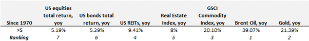 Historically when inflation exceeds 5%, commodities have been the best performers (oil as well a broader commodity index take the first and second places respectively). They have been followed by gold in third place and then by US REITs in fourth place.