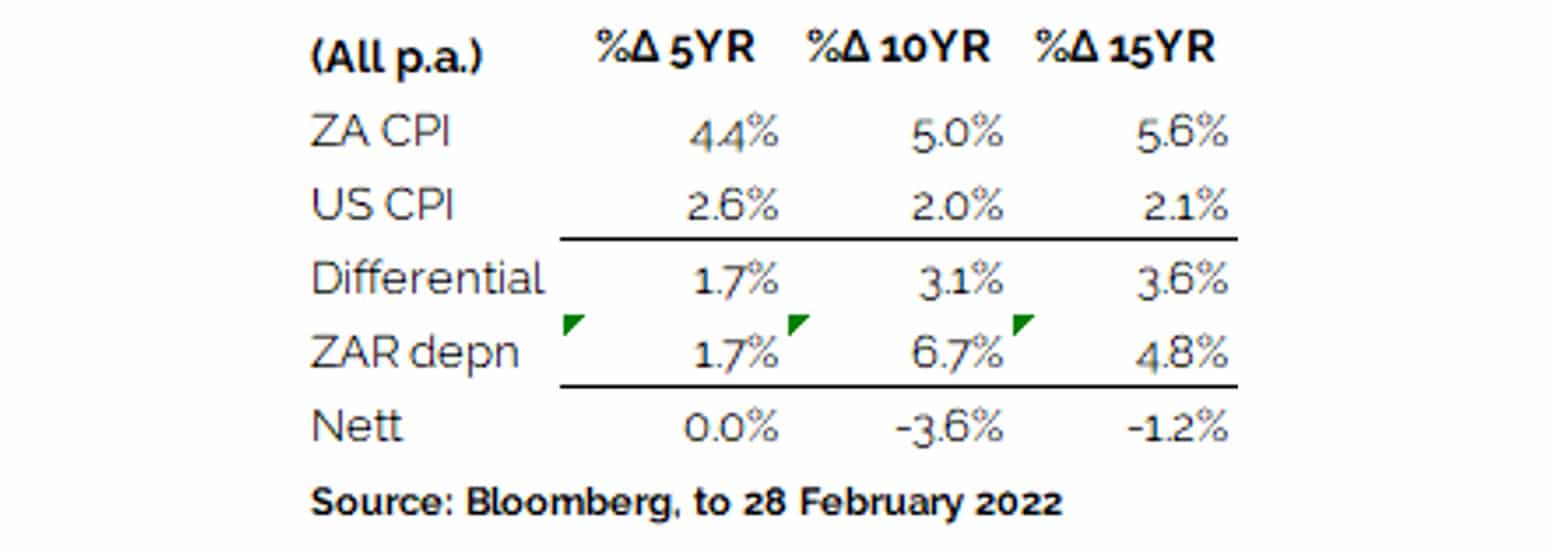 Secondly, it is irresponsible to focus on the preservation of capital in Rands. Who would want to measure their returns in a soft currency (like the Rand) rather than a hard currency (like the Dollar)? In the short-term, impacts of movements in the Rand on local inflation may be minimal but in the longer-term, they feed through to local CPI. This has led to a steady erosion of the purchasing power of domestic savers (and non-savers for that matter) because the unmistakeable trend in the Rand has been downwards.