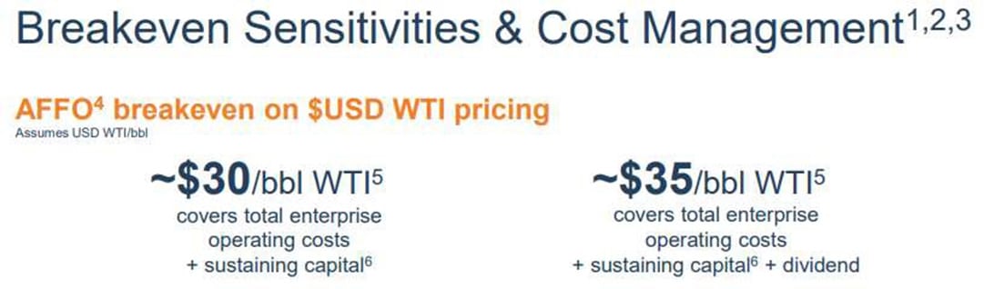 Thirdly, the cost profile of Suncor is attractive. Suncor has worked hard to optimize its operations and can operate at breakeven, including its dividend payments, at approximately $35 per barrel of oil. This provides a meaningful cushion when oil prices decline, and on the flip side offers substantial gearing to higher oil prices.