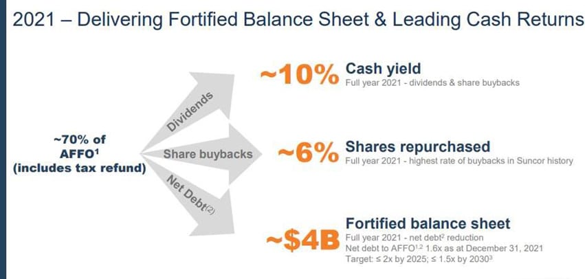 Starting January 2022, Suncor has stated that it will be repurchasing 5% of its shares over the next twelve months, with the intention of completing this program in January 20 23. In practice, this means that with its current dividend yield of around 4%, investors are going to get at approximately 10% in capital returns in 2022.