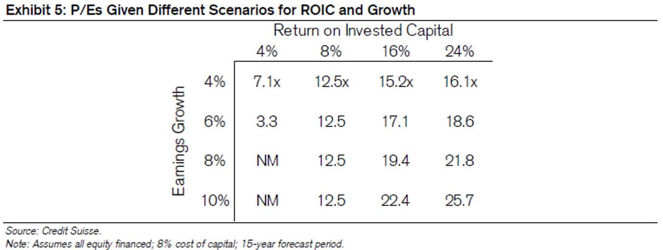 Capital efficiency matters: in order to grow, A needs all the money it makes and has less surplus available to pay dividends and buy back shares while B can do both. The table below (from Credit Suisse) provides a potential framework for investors to use when assessing P/E multiples and returns on invested capital.