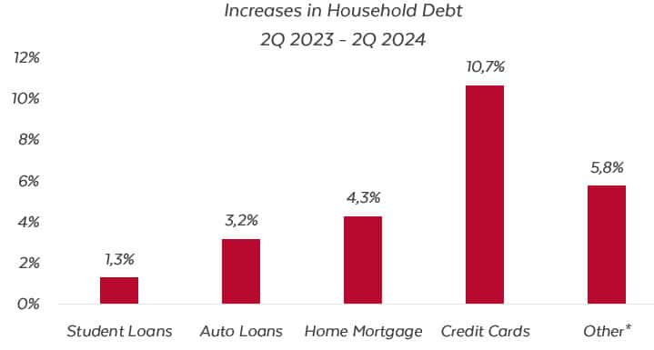 Total US household debt of $18 trillion has also steadily increased by roughly 4.3% in 2024. The more concerning factor is that credit card debt, while only a small portion at $1 trillion, is rising much faster than all other debt segments, see the chart below. This is concerning because consumers have spent most of their pandemic-era excess savings and are turning to credit cards, bad debt in the eyes of economics, to maintain their spending levels. On top of this, default rates on credit cards have slowly started increasing as higher borrowing rates have started to bite.