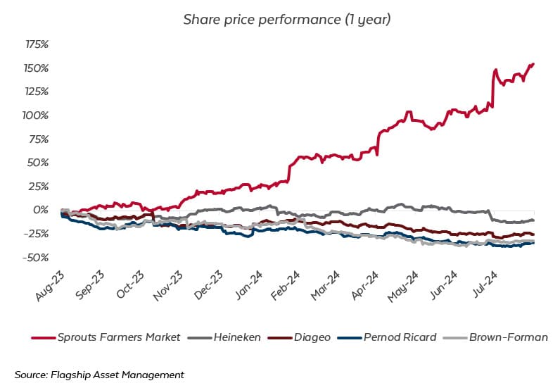 Share prices are generally driven by investor expectations of future returns. Over the past year, Sprouts has outperformed some of its better-known staple peers by leaps and bounds. If this is anything to go by, investors could easily conclude that while consumers are more discerning about where they spend their money, they remain willing to spend – and Sprouts Farmers Market has become a consumer favourite.
