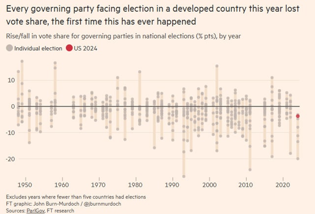 In 2024, the world witnessed a remarkable occurrence; every governing party in major developed countries that held elections lost the vote, a singular event in over a century.