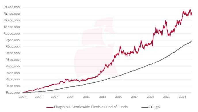 R100 000 invested in April 2003 would be R 1,296,656 on 30 April 2025. |