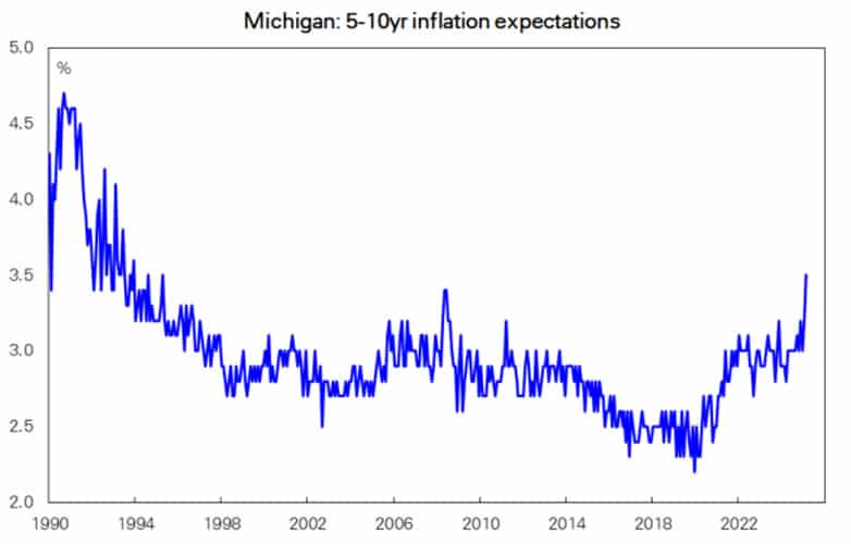 US economic data was a mixed bag. Both normal and core CPI, which excludes food and energy, were higher than expected, with the Fed noting they are in no hurry to further reduce rates. On top of this, average hourly earnings data also came in stronger than forecast, potentially leading to further upward pressure on prices. Looming Trump administration tariffs may also add to this. The result is US 5–10-year inflation expectations at 3.5%, the highest number recorded since April 1995.