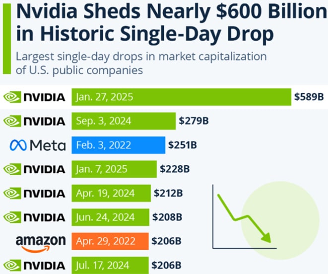 Adding to the month-end volatility was news of Deepseek, a Chinese rival to the West’s perceived AI-dominance, which cast doubt on all previous AI-related assumptions. This resulted in a rout in the tech market, evidenced by Nvidia erasing $589 billion in market cap in a single day. To put this into context, that is more than the market cap of all but 13 US companies.